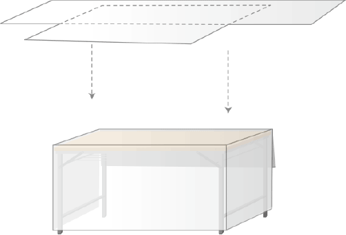 テーブルクロスの仕立て方法には周囲縫製、ボックス加工、半ボックス加工と3種ございます。また腰幕やワゴン幕のように天板に布を被せない製品もございます。