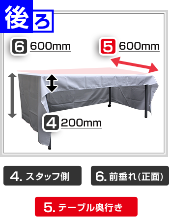 また、縦幅も同じように、机の天板の奥行と垂れを足す事で算出する事が出来まして「天板の縦幅(奥行き)600mm+前垂れ600mm+後の垂れ(スタッフ側)200mm」と言う計算となります。つまり、この場合ではテーブルクロスの横幅は1400mmであると言う事が分ります。