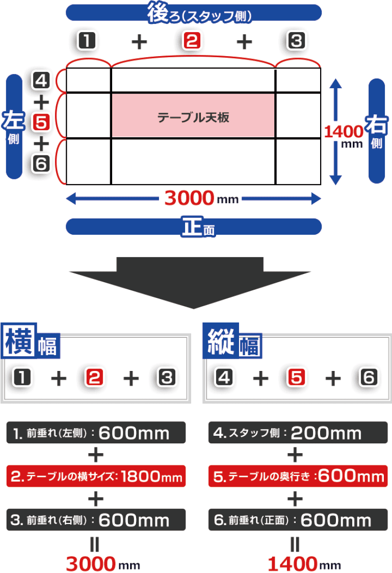 横幅を算出する場合は「机天板の横幅+垂れの長さ」となります。つまり、一般的なテーブルサイズ(サンプル①)を参考に「天板の横幅1800mm+右側の垂れ600mm+左側の垂れ600mm」と言う計算になり、テーブルクロスの横幅が3000mmと言う事が分ります。